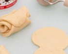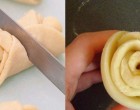 4. A feltekert tésztát vágjuk két egyenlő részre. Ennek eredményeképpen két rózsát kapunk.