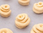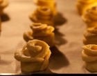 5. Amikor minden „rózsával” elkészültünk, egy tepsibe tegyünk sütőpapírt, majd erre helyezzük rá a „rózsáinkat”!