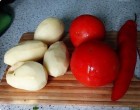A zöldségeket mosd meg. A burgonyát hámozd meg és vágd vékony szeletekre, fontos, hogy vékony legyen, különben félig nyers maradhat. Vágd vékony szeletekre a paradicsomot, a hagymát és a paprikát is.