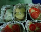A zöldségeket rétegezd a húsra, hagyma, burgonya, paradicsom, paprika. Mindegyik adag tetejére kenj egy evőkanálnyi majonézt.