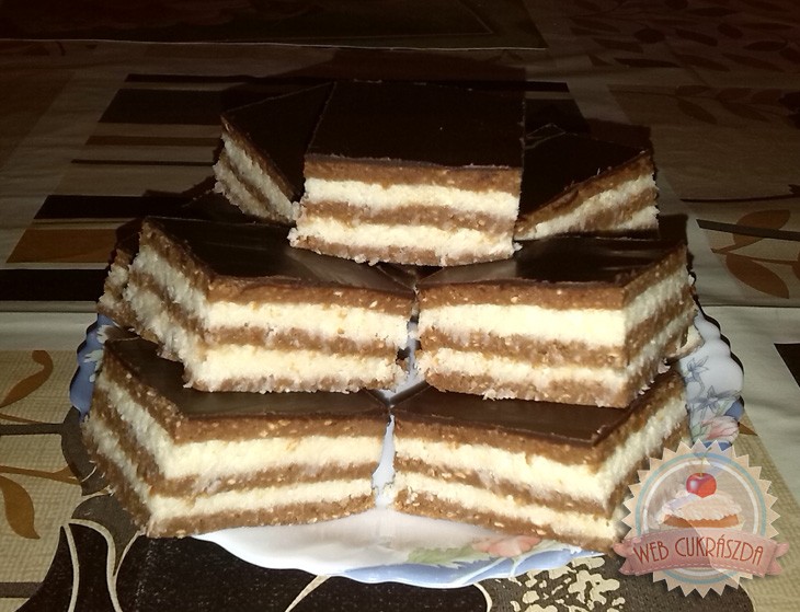 A tészta hozzávalóit összedolgozom annyi tejjel, hogy jól formázható masszát kapjak. Három részre osztom és porcukorral megszórt deszkán a tepsi méretének megfelelő lapokat nyújtok belőle (20 × 30 cm). Az első lapot a tepsibe helyezem, erre kenem a krém felét, ráteszem a második lapot, majd a krém másik fele következik, végül a harmadik lappal befedem.