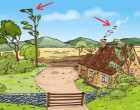 A rajzon egy tanyasi házat láthattok, körülötte dombok és mezők vannak, a ház mellett pedig egy kövekből készült kerítés látható, egy fából készült kapuval és néhány fával körülvéve. Észre vettetek valami olyan dolgot amely nem illik a képbe?