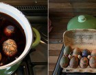 1. Szükségünk lesz rengeteg vöröshagymára, pontosabban azok héjára! Körülbelül 3 kg hagymát kell megtisztítani, majd a száraz, narancsvörös színű héjakat tegyük az edénybe, öntsünk rá vizet és forraljuk fel. Ebből igencsak erős festőhatású főzet keletkezik. A beburkolt tojásokat az edény aljára kell helyezni, lehetőleg a hagymahéjak alá. 10 perc elteltével a tojásokat kiszedhetjük, egyfelől megfőttek, másfelől pedig a levelek, tollak lenyomatai már megfelelően látszanak.