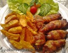 Hozzávalók: 1 kg csirkeszárny 25 dkg szeletelt bacon só ízlés szerint 1 tk szárnyas fűszerkeverék 1 mk cayenne bors