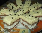 Az egyiket a tepsi aljára tesszük, majd a kókuszos krémet tesszük rá: 3 tojásfehérjét kemény habbá verjük 15 dkg porcukorral, majd beleteszünk 20 dkg kókuszt és az első lapra kenjük, majd rátesszük a másik lapot, és megsütjük.