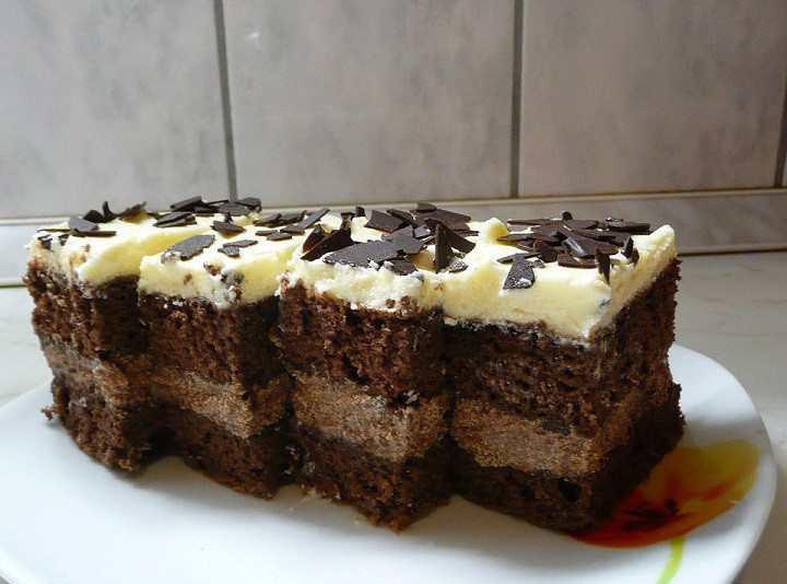 Hozzávalók:8 tojás25 dkg cukor8 ek forró víz20 dkg liszt2 ek kakaó1 tk szódabikarbónaKrémhez:9 dl tej3 cs tejszín ízű pudingpor25 dkg Rama margarin25 dkg porcukor1 tábla fehér csoki1 tábla ét csoki(vagy 2 ek kakaó)Elkészítése:A tészta hozzávalóit összedolgozzuk. Nagy (gáz tepsi)méretű tepsiben megsütjük, hűlni hagyjuk, majd keresztben kettévágjuk.A krémhez a pudingport cukor nélkül megfőzzük,kihűtjük. A Rama margarint a porcukorral habosra keverjük,majd összedolgozzuk a kihűlt pudinggal. Kettévesszük a krémet,az egyikbe az olvasztott fehér, a másikba az ét csokit belecsurgatjuk, kikeverjük.Összeállítás:kakaós lap,csoki krém, kakaós lap fehér krém. A tetejét csoki darával,vagy csoki forgáccsal díszítjük.