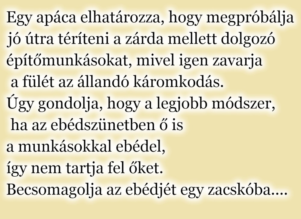 Egy apáca elhatározza, hogy megpróbálja jó útra téríteni a zárda mellett dolgozó építőmunkásokat, mivel igen zavarja a fülét az állandó káromkodás.Úgy gondolja, hogy a legjobb módszer, ha az ebédszünetben ő is a munkásokkal ebédel, így nem tartja fel őket.Becsomagolja az ebédjét egy zacskóba, és ebédidőben odamegy a munkásokhoz.- Jó napot uraim! - kezdi a mondandóját mosolyogva. - Ismerik Önök Jézus Krisztust?A munkások egymásra néznek döbbenten, majd egyikük odakiált az építkezés másik végében üldögélő munkásoknak:- Héé! Ismeritek ti Jézus Krisztust?- Mé' kérded? - kiabálnak vissza.- Mert itt a felesége az ebéddel!