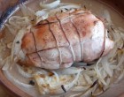 Kötözzük össze az egészet konykai zsinórral és tegyük egy tepsibe. Öntsünk mellé egy pohár fehér bort, vágjuk fel a vöröshagymát és tegyük mellé. Majd süssük az egészet 190 fokra előmelegített sütőben, 55 percig.
