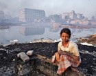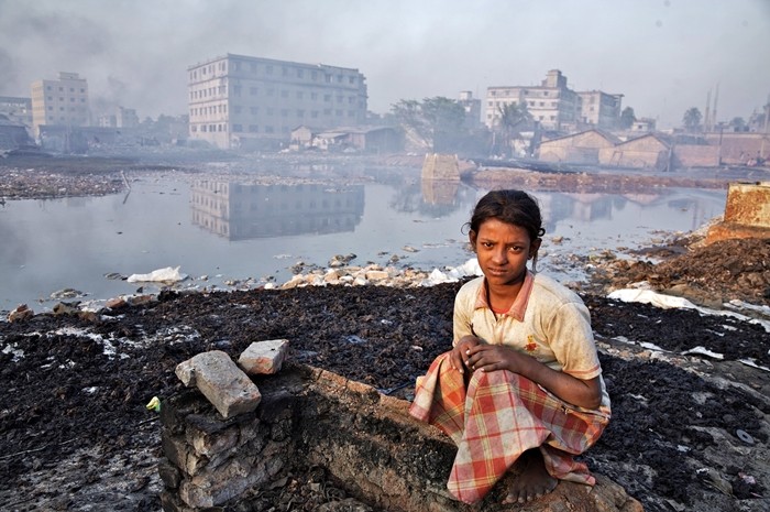 Egy fiatal lány ül Banglades külvárosában a folyóparton