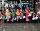 Az áradásokat követően nők és gyermekek kannákkal várnak friss ivóvízre egy indiai településen