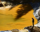 Egy gyermek játszik annak a perui aránybánya ülepítő medencéjében, ahol a szülei dolgoznak