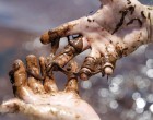 Egy ökológus keze a 2010. 06. 7.-én a Mexikói öbölben bekövetkezett „Deepwater Horizon” fúrótorony katasztrófáját követően