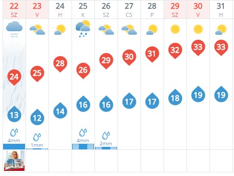Gatyát felkötni! Megint jön a rekkenő hőség! Szóval klíma (ha van), ventilátorok, vizes törcsi a nyakba, sok folyadék és sok türelem. Hétfőn már országszerte 25 - 28 fokra számíthatunk. Kedden még kapunk egy kis esőt, de a hőmérséklet ugyanúgy 25 - 28 fok között alakul, majd szerdától ugrik felfele a hőmérséklet 29 fokra és jövő hétvégére ismét 33 fokot mérhetünk. Ismét rekkenő hőség kezdődik. Figyeljünk a folyadékmennyiségre, a megfelelő testhőmérséklet fenntartására és fokozott figyelemmel legyünk a szívbetegek, idősek felé, de úgy egyáltalán embertársainkra is úgy ügyeljünk, mint magunkra!
