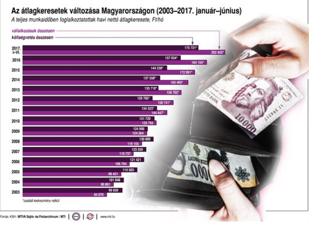 290 300 forint volt a bruttó átlagkereset, 14 százalékkal magasabb, mint egy évvel korábban. A KSH szerint a növekedésre a minimálbér és a garantált bérminimum 15, illetve 25 százalékos emelése, a költségvetési szféra egyes területeit, továbbá az állami közszolgáltató cégek dolgozóit érintő keresetrendezések voltak hatással. Egyszóval: a kormány béremelési politikája érezteti hatását. A teljes munkaidőben alkalmazásban állók nemzetgazdasági szintű átlagos bruttó keresete – a legalább öt főt foglalkoztató vállalkozásoknál, a költségvetési intézményeknél és a megfigyelt nonprofit szervezeteknél – 297 300 forint volt.