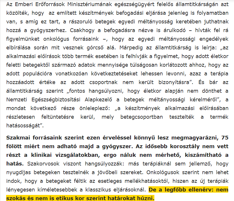 Novemberben az államtitkárság bejelentette, négy onkológiai terápiás területen -melanoma, prosztatadaganat, onkohematológia, tüdődaganat – 15 új, innovatív gyógyszer segíti a betegek gyógyulását, köztük a tüdődaganat elleni két új hatóanyag, amely mintegy háromszáz páciensnek ígér túlélést. Csakhogy jött a hidegzuhany: szakmai források szerint a készítmények csak a 75 évnél fiatalabbaknak adhatók, idősebbeknek ugyanis várhatóan nem támogatja majd a pénztár.