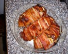 Utána a karajt/csirkét kívülről sóval, grillfűszerrel bedörzsöljük, mézzel megkenjük. Az eredeti recept alapján a tűzálló tálat kell kibélelni szalonnaszeletekkel, azokra vöröshagymakarikákat kell szórni, és erre az ágyra fektetni a karajt. Ezután vissza kell hajtani a szalonnaszeleteket, hogy betakarja a husit. Mivel nekem nem egy darab egész húsom volt, hanem több kisebb, így én ezeket egyenként csomagoltam be baconbe.