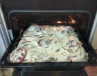 Az előző nap bepácolt karaj mennyiségének kb. a felét ráterítjük a hagymás szalonnás ágyra.
