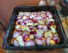 A burgonyára felkarikázott vöröshagyma és lilahagymát teszünk, amely a karaj szeletek ágya lesz.