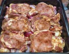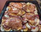A hagymakarikákra ráhelyezzük a maradék karaj szeleteket melyeket egy pici olajjal szintén meg csepegtethetünk.
