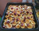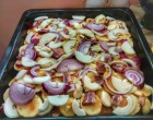 majd csíkozott darabolt füstölt húsos szalonna, és a burgonya szeletek közé ezúttal fokhagyma gerezdeket helyezünk.