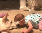 Nagyon vidám volt, és jól érezte magát a kutya társaságában - jókedvét a mosolyával is kommunikálta az állat felé. Ez igazán különleges pillanat volt. A baba közeledésére a kutya elég lezseren reagált, és úgy tűnt, hogy nem hagyja kizökkenteni magát a pihenésből.