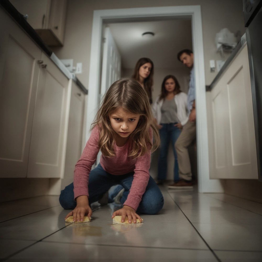 Ahogy benézett, a látvány beléfagyasztotta a levegőt.A földön, egy vödör mellett, Emma térdelt, kezében egy sárga szivacs, és sírva törölte a padlót. A kicsi ujjai kipirosodtak, a keze remegett. A sarokban Katalin állt, karba tett kézzel, és ridegen figyelte.