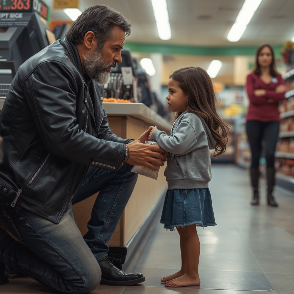 A húsospulttól lépett elő egy férfi. Motoros dzsekit viselt, erős, meggyötört arcán borosta ült, és úgy jött, mintha az egész világot magával hozná. Léptei tompán puffantak a linóleumon. A kasszához sétált, letérdelt a kislány elé.