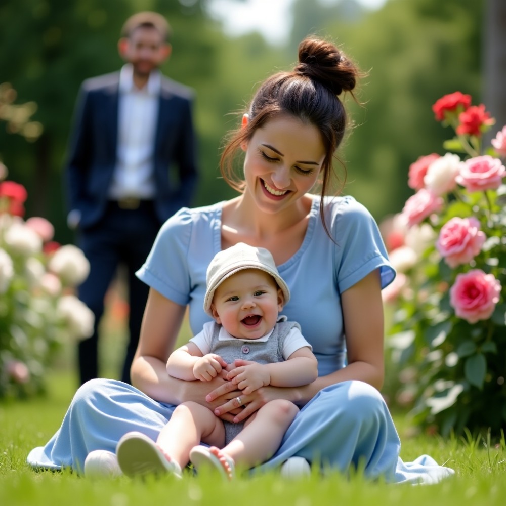 A sötétbarna haját szoros kontyba fogta, a fűben ülvejátszott a kisfiúval. Repül a, repül a baba, ezt játszották. Magasba emeli a gyereket, aki folyamatosan kacagott.