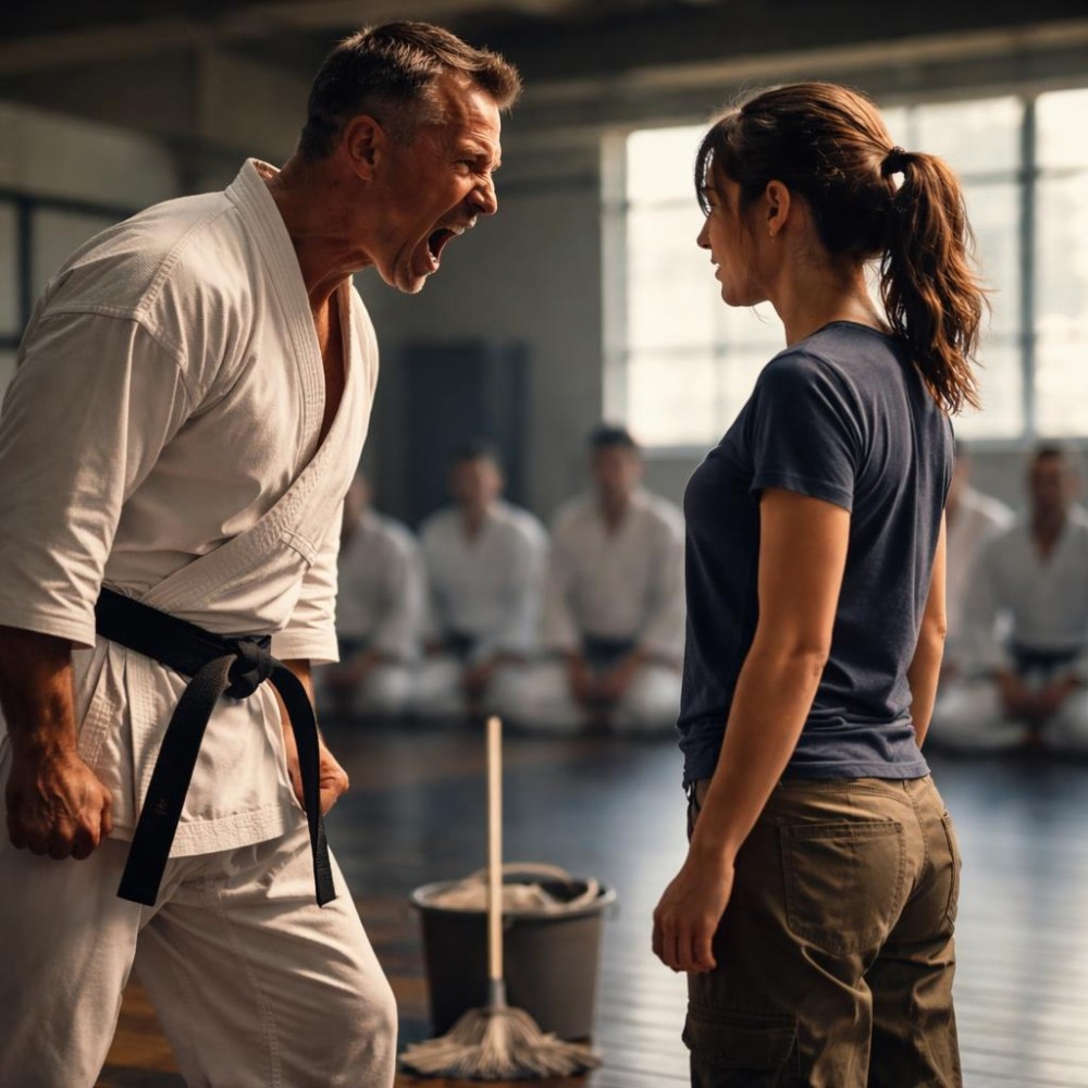 A mondat nem volt kihívó, nem volt benne feszültség, mégis megváltoztatta a levegőt a teremben. Gábor tekintete megkeményedett, és a tanítványok közül többen ösztönösen hátrébb húzódtak, mintha egy láthatatlan vonalat éreznének köztük. Az edző lassan kihúzta magát, a fekete öv a derekán szinte hangsúlyossá vált ebben a csendben.
