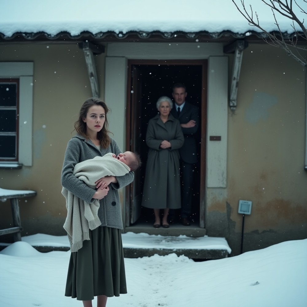 A decemberi égbolt sötét volt, mint egy bezárt pince. A szél süvítve tépte végig a falu szűk utcáit, az ereszekről jégtűk lógtak, és a hó vakító fehérsége csak még ridegebbé tette az éjszakát. A falu határában, egy öreg vályogház tornácán egy asszony állt mezítláb, karjában egy alig háromnapos csecsemővel. A hó elnyelte a lábujjait, a ruhája átázott, a kezei lilák voltak a hidegtől. A gyerek csendben aludt, összegömbölyödve az anyja mellkasán, mintha érezné, hogy most nem szabad sírni.