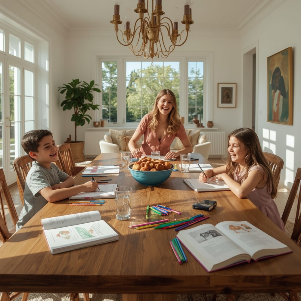 A hosszú tölgyfaasztal fölött meleg fényű lámpa ragyogott. Az asztal tele volt színes ceruzákkal, félig kész rajzokkal, tankönyvekkel és apró morzsákkal. A közepén egy nagy, kék tálban frissen sütött túrós batyu illatozott — Anna specialitása.