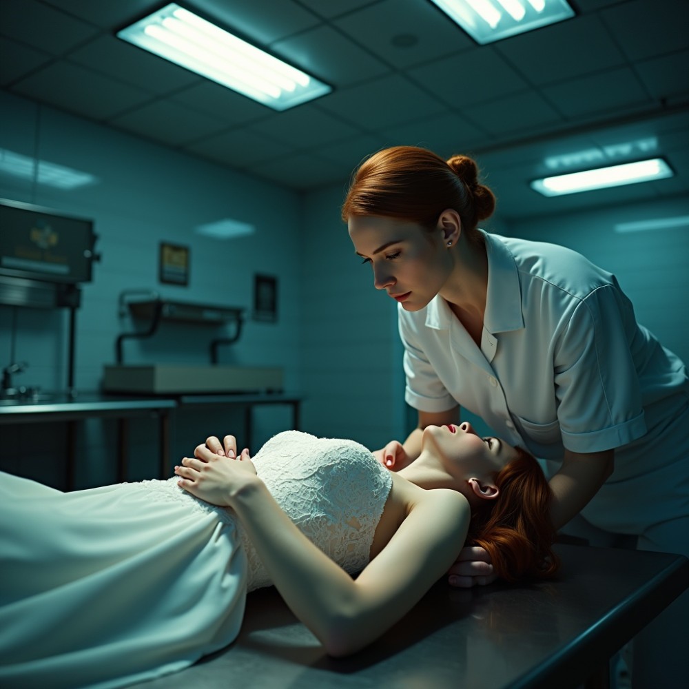 A képernyőn kezdetben csak a neonlámpák hideg csillogása látszott. A menyasszony mozdulatlanul feküdt, a csipkeruha úgy takarta a testét, mintha még mindig ünnep lenne. A helyiség csendje szinte nyomasztóan rájuk telepedett – képen keresztül is. Az első óra eseménytelenül telt. A második lassan, vontatottan haladt.
