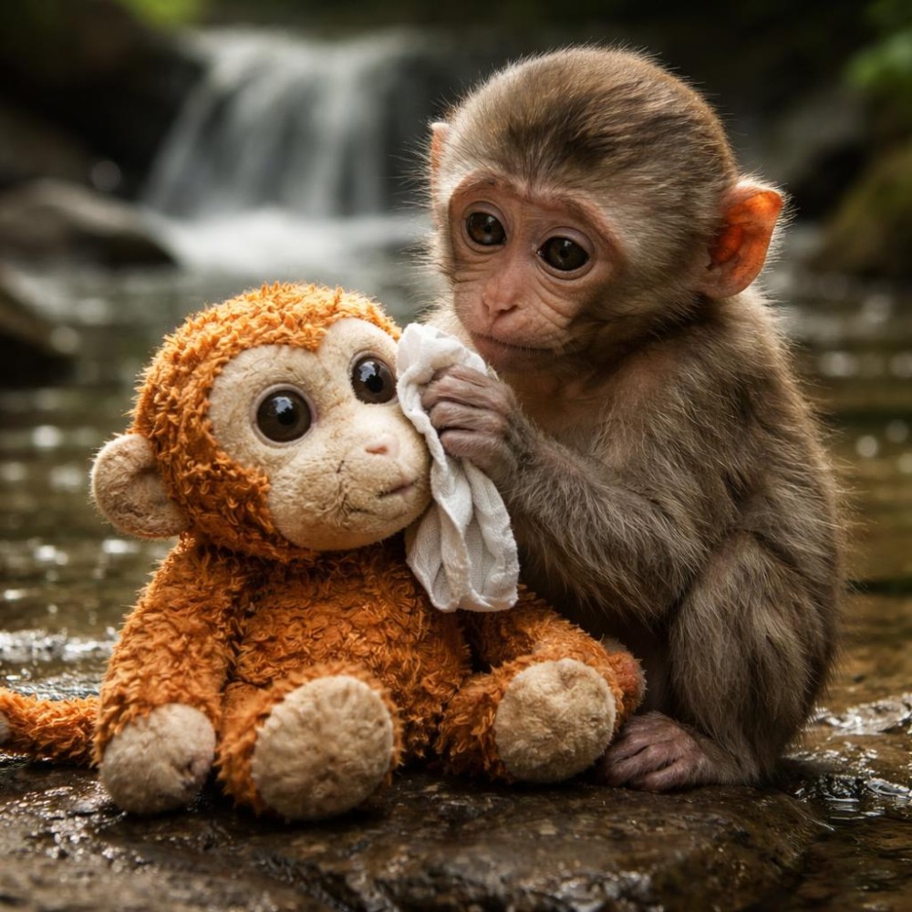 A túloldalon egy idősebb majom közelebb merészkedett, kíváncsian, de nem barátságosan. Megállt pár lépésre, oldalra döntött fejjel figyelte az új jövevényt. A kismajom erre ösztönösen még közelebb húzta a plüsst, és lehajtotta a fejét, mintha láthatatlanná akarna válni. Az idősebb egy ideig még állt, aztán hirtelen felcsattant, és elugrott, mintha csak jelezni akarta volna a határokat.