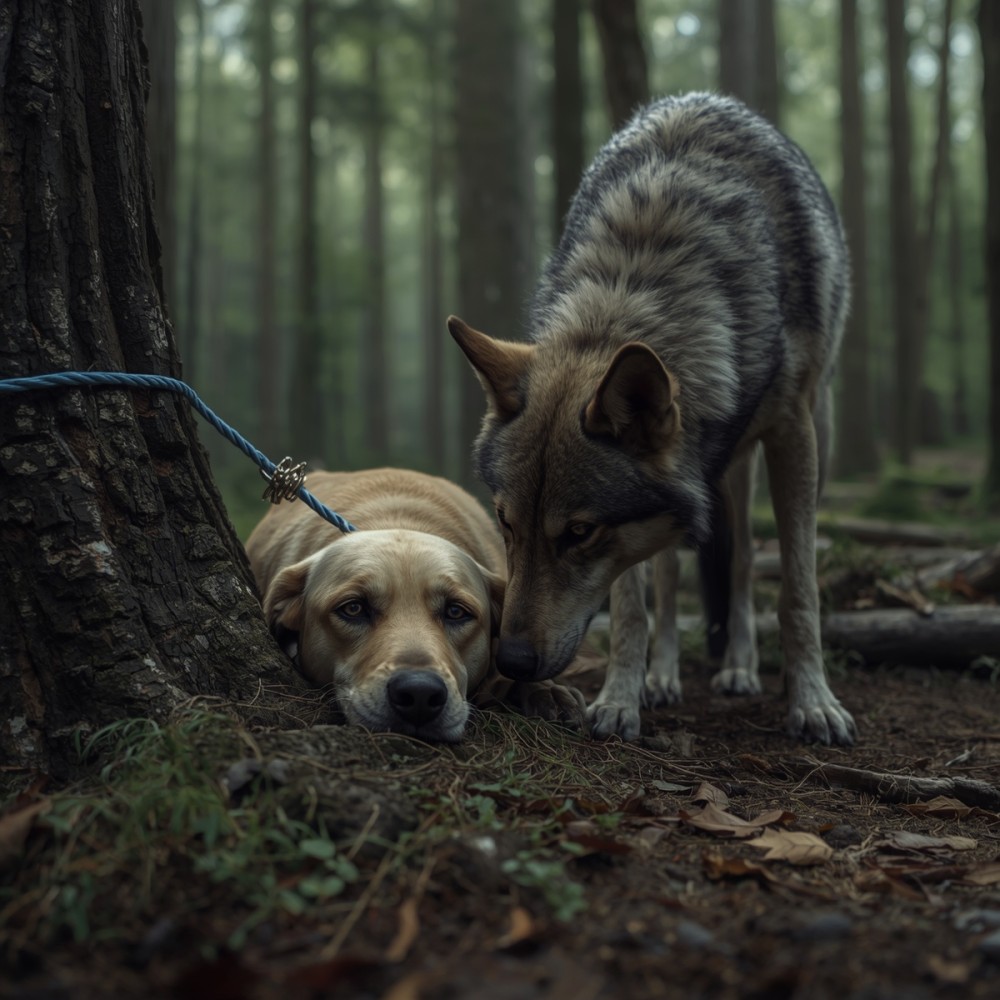 A farkas lassan lehajtotta a fejét, és nagyot szippantott a levegőből. Megérezte a vér fémes szagát a lánc körül, a kioldódó félelmet és a kimerültséget, amit egyetlen állat sem tud elrejteni a természet elől. A kutya reszketése egy pillanatra abbahagyta a távolságot, mintha a farkas jelenléte épp annyira rémisztette volna meg, mint amennyire valami megmagyarázhatatlan módon mégis megnyugtatta: nem volt benne azonnali veszély.