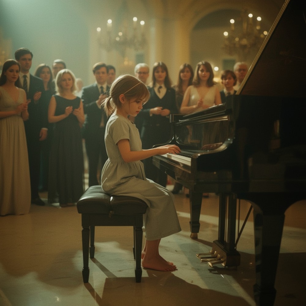 Tapsvihar zúgott, emberek könnyeztek, mások csak bámultak. A kislány dermedten ült a zongora mellett, nem értette, mi történik. A szíve a torkában dobogott.
