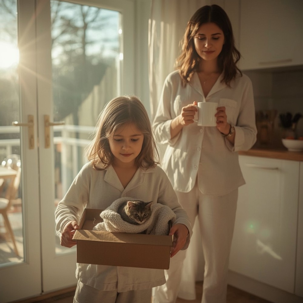 A konyha felől gyenge fény szűrődött ki, az ajtó lassan kinyílt. Mira szíve vadul vert, és a torkába kúszott a félelem: ha anyja meglátja a macskát, vége. Azonnal kidobatja, vagy még rosszabb — őt is felelősségre vonja.