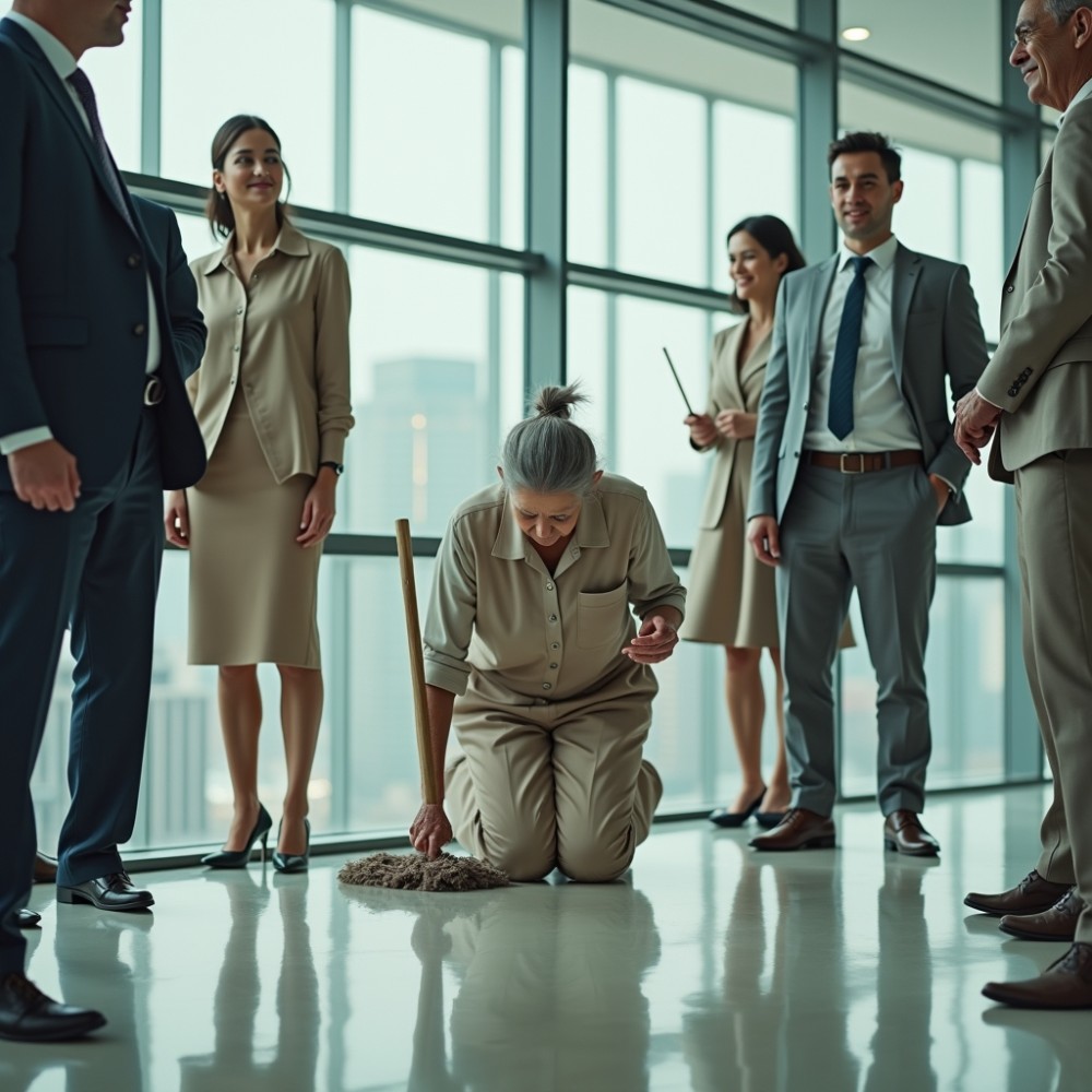 Az idős nő akkor lépett be, amikor egy csoport elegáns férfi épp hangosan nevetve haladt el mellette. Egy pillanatra félre kellett húzódnia, hogy ne ütközzenek össze, a kék vödör halkan koppant a márványpadlón. A ruhája egyszerű volt, kissé túl nagy rá, mintha kölcsönkapta volna, a mellkasán egy névtábla: „Klára”. Nem nézett körbe kíváncsian, nem kereste a szemkontaktust, mégis minden mozdulatában volt valami nyugodt határozottság, ami nem illett a szerephez. A biztonsági kapun gond nélkül átengedték, senki sem kérdezett semmit, mintha természetes lenne, hogy ott van, és mégis teljesen észrevétlen maradt.