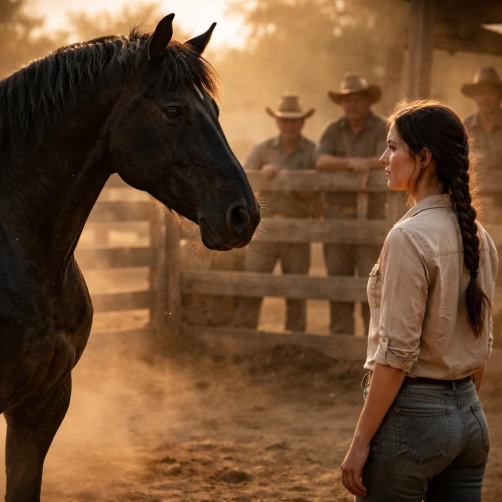 A tömeg mögötte visszafojtotta a lélegzetét. Nem történt semmi látványos, és épp ez volt az, ami szokatlan volt. Nem volt kiabálás, nem volt ostorcsapás, nem volt erőfitogtatás. Csak egy lány állt egy lóval szemben, és nem csinált semmit.
