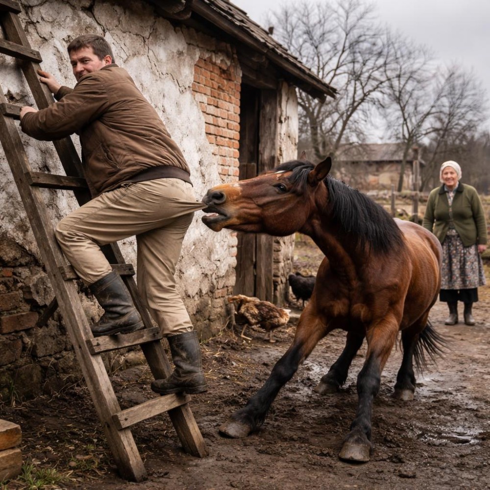 A vályogház fala hidegen párállt a kora reggeli ködben, mintha maga sem tudná eldönteni, hogy még tél van-e vagy már tavasz. Jani a létrán állva próbált nem lenézni, de a derekába feszülő húzás egyre erősebb lett, és valahogy mindig visszakényszerítette a figyelmét lefelé. A csizmája alatt nyikorgott a fa, a keze csúszott a fokon, és közben azon gondolkodott, hogy ez az egész ötlet eleve rossz volt. A tetőn egy meglazult cserépet akart visszaigazítani, semmi különös, csak egy gyors mozdulat – de az udvaron álló barna ló, amelyet tegnap még szelídnek nevezett volna, most valami egészen mást képviselt. Az állat orra makacsul a nadrágjába fúródott, és minden egyes mozdulattal egyre határozottabban próbálta lerángatni róla.