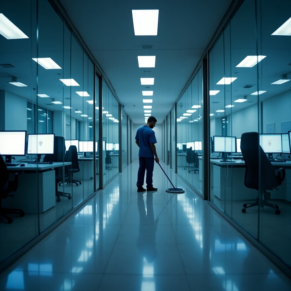 A férfi a felmosónyélre támaszkodva dolgozott, mozdulatai szinte hangtalanul siklottak a gránitpadlón. Tartása nyugalmat árasztott, arca pedig mindig félhomályban maradt, mert ő maga gondosan kerülte a tekinteteket.