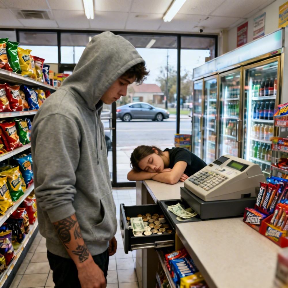 Mielőtt kilépett volna, még egyszer visszanézett. A lány ugyanúgy aludt, a pénz ott feküdt mellette, a bolt pedig csendesen, sértetlenül várta a következő pillanatot. A férfi egy másodpercig állt az ajtóban, mintha mondani akarna valamit, de végül csak lehajtotta a fejét, és kilépett az utcára. Az ajtó halkan becsukódott mögötte.