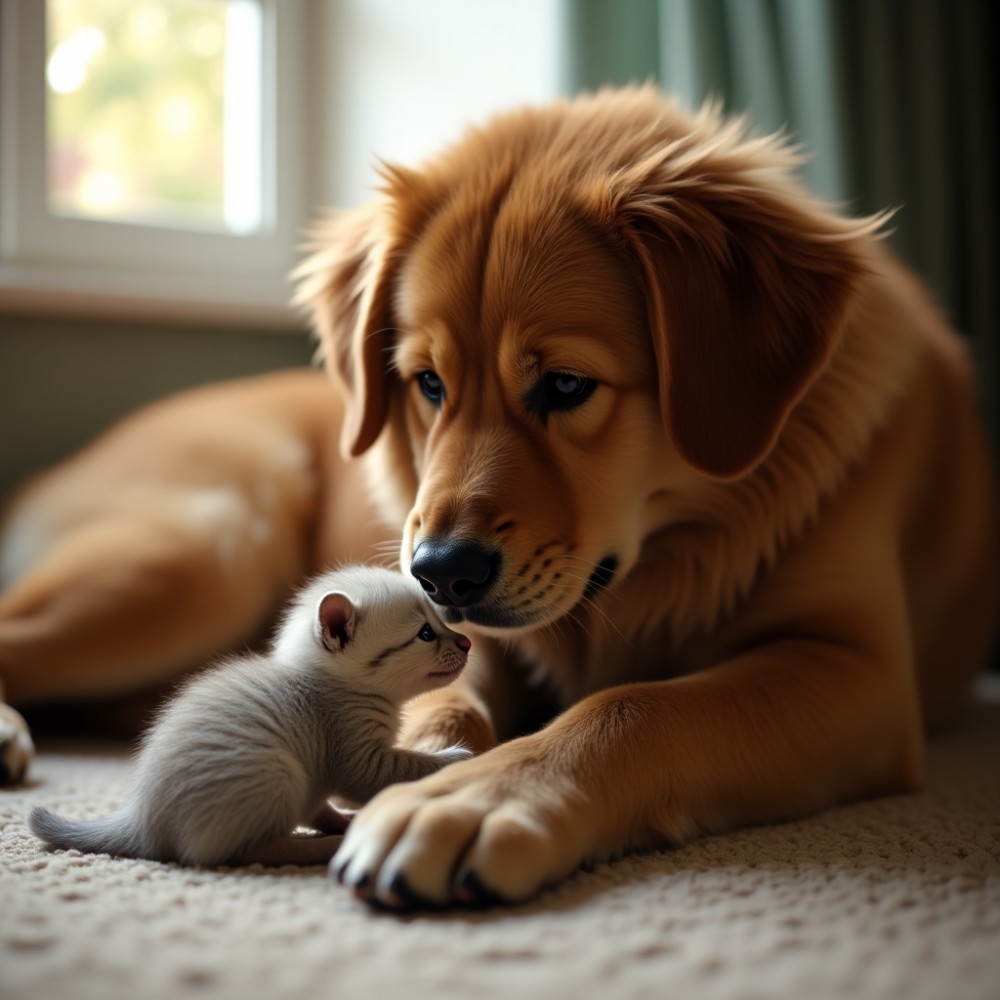 A cica ekkor egy vékonyka, meleg testtel nekidőlt a kutya mellkasának. Bundás megmozdult — csak éppen annyira, hogy védő ívbe rendezze a mellső lábait, mintha egy apró fészket formálna a kicsi köré.