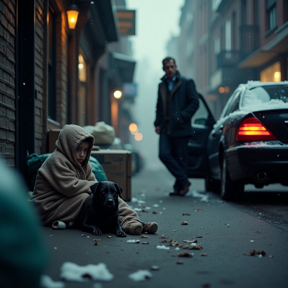A hó kezdett erősebben hullani, apró fehér pelyhek kergették egymást a szélben. A sikátor félhomályában valóban körvonalazódott valami: egy kicsi alak, összegömbölyödve, rongyos takaró alatt. Mellette egy kistestű, sötét foltos kutya kuporgott.