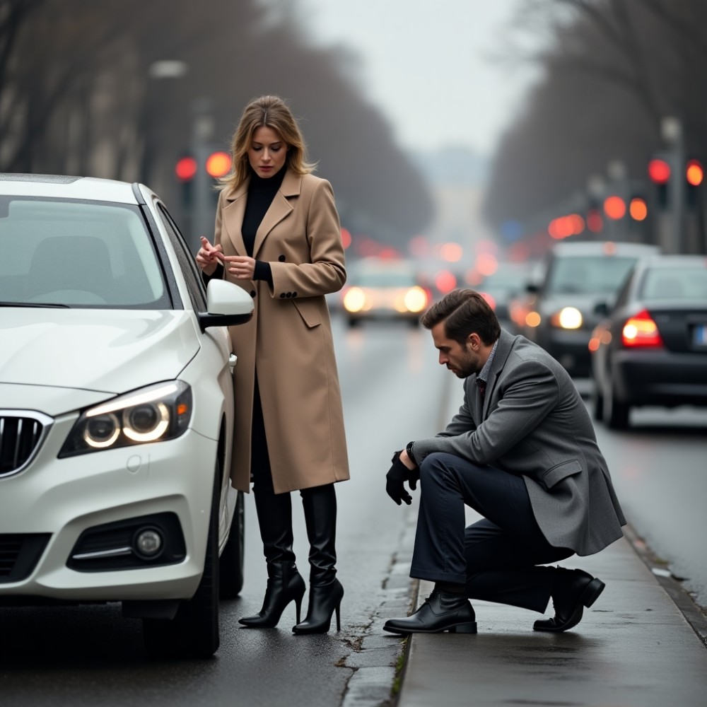 A Blaha felé araszolva hirtelen meglátott valamit a tükörben. Az út szélén, egy fehér Peugeot állt vészvillogóval, mellette egy nő próbálkozott a pótkerékkel. Elegáns kabátban, magas sarkú csizmában, kezében egy hidraulikus emelővel, ami láthatóan idegen volt számára.
