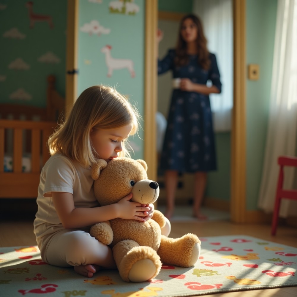 Nóra összerezzent, a kis ujja még jobban ráfonódott a plüssre. A szeme nagy volt és sötét, tele bizonytalansággal.