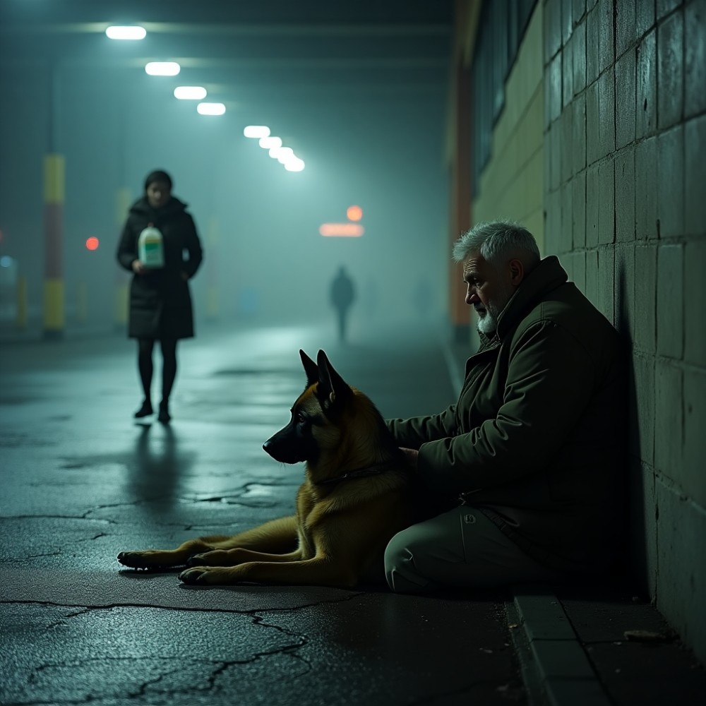 Akkor láttam meg. A bolt melletti parkoló legszélén, ahol a fény már alig világította meg a betont, egy férfi ült a földön, rongyos kabátban, hátát a falnak vetve. Mellette egy nagytestű, komor tekintetű kutya feküdt, úgy, mintha bármikor ugrásra kész lenne. Mégis volt valami megnyugtató abban, ahogyan a kutya a férfi mellé simult – hűségesen, némán, mintha tudná, hogy ő most az egyetlen, aki számít.
