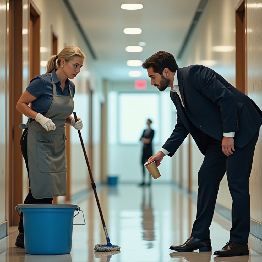 A folyosó csendje hirtelen nehézzé vált, mintha a levegő is megállt volna egy pillanatra. Éva csak nézte a padlót, majd lassan vissza a férfira. A kezében megfeszült a felmosó nyele, és valahol mélyen, a megszokott türelem alatt, valami megmozdult benne, amit már régóta nem engedett felszínre. A férfi pedig csak állt ott, mintha egy előadást várna, kíváncsian, kissé előrehajolva.