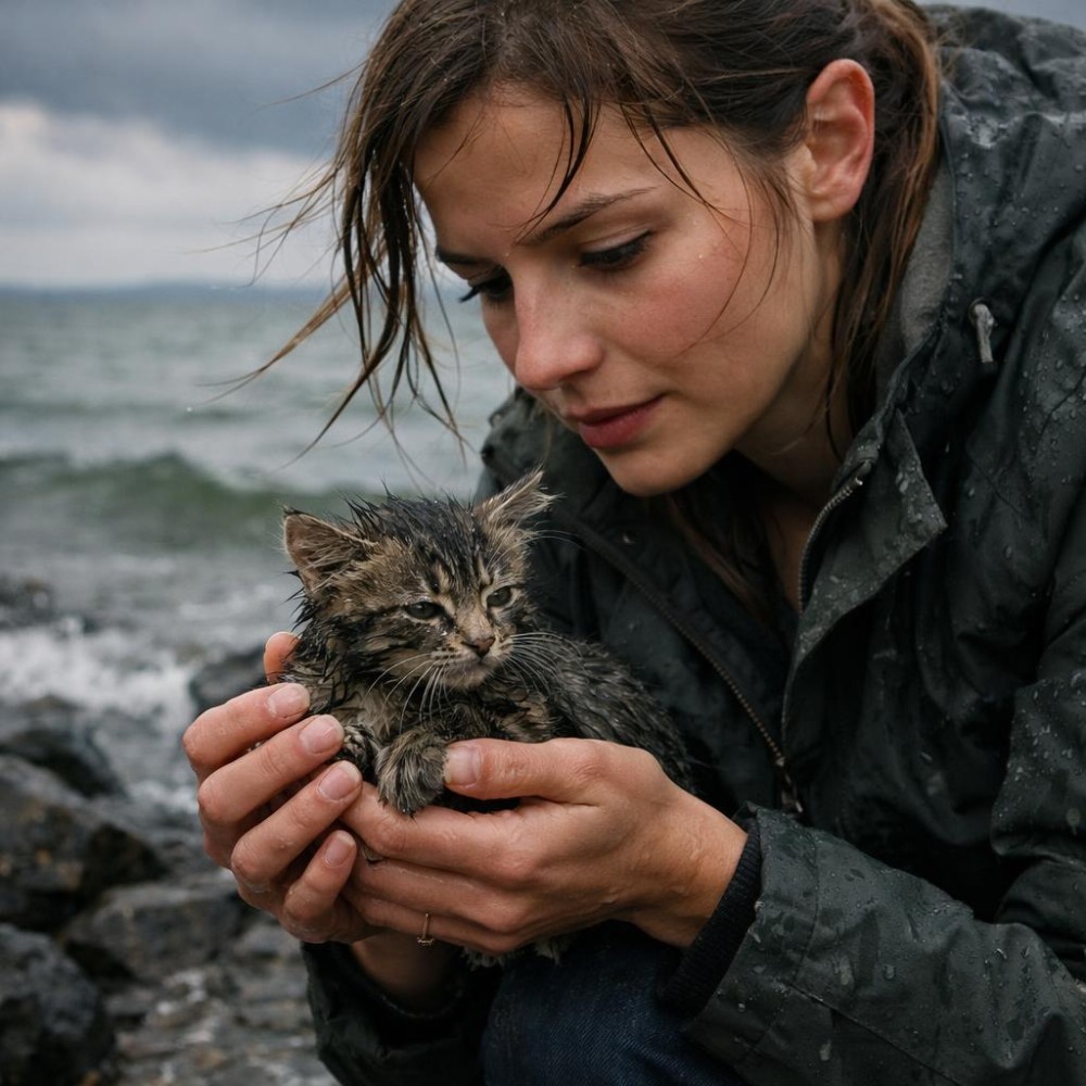 Letette a vászonzacskót, és óvatosan leereszkedett a kövek közé. A cipője azonnal átázott, de nem figyelt rá. Amikor kinyújtotta a kezét, a kiscica először megmerevedett, majd hirtelen belekapaszkodott az ujjaiba. Nóra a mellkasához húzta, a sáljába tekerte, és felállt.