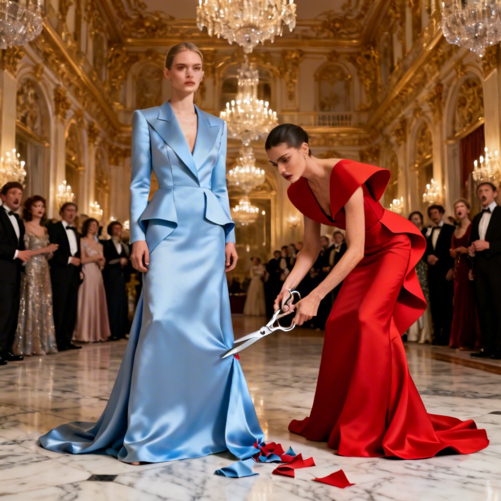 Az anyag hangja meglepően halk volt. Nem az a drámai szakadás, amit az ember elképzelne, inkább egy száraz, rövid suhanás, mintha valaki papírt vágna. Mégis úgy éreztem, mintha a hang végigvisszhangzana a teremben. A szoknya szegélyéből egy keskeny darab levált, majd lassan lecsúszott a parkettre. Egy pillanatig senki sem mozdult. A zenekar játszott tovább, de a dallam bizonytalanná vált, mintha a zenészek is próbálnák kitalálni, mi történik.
