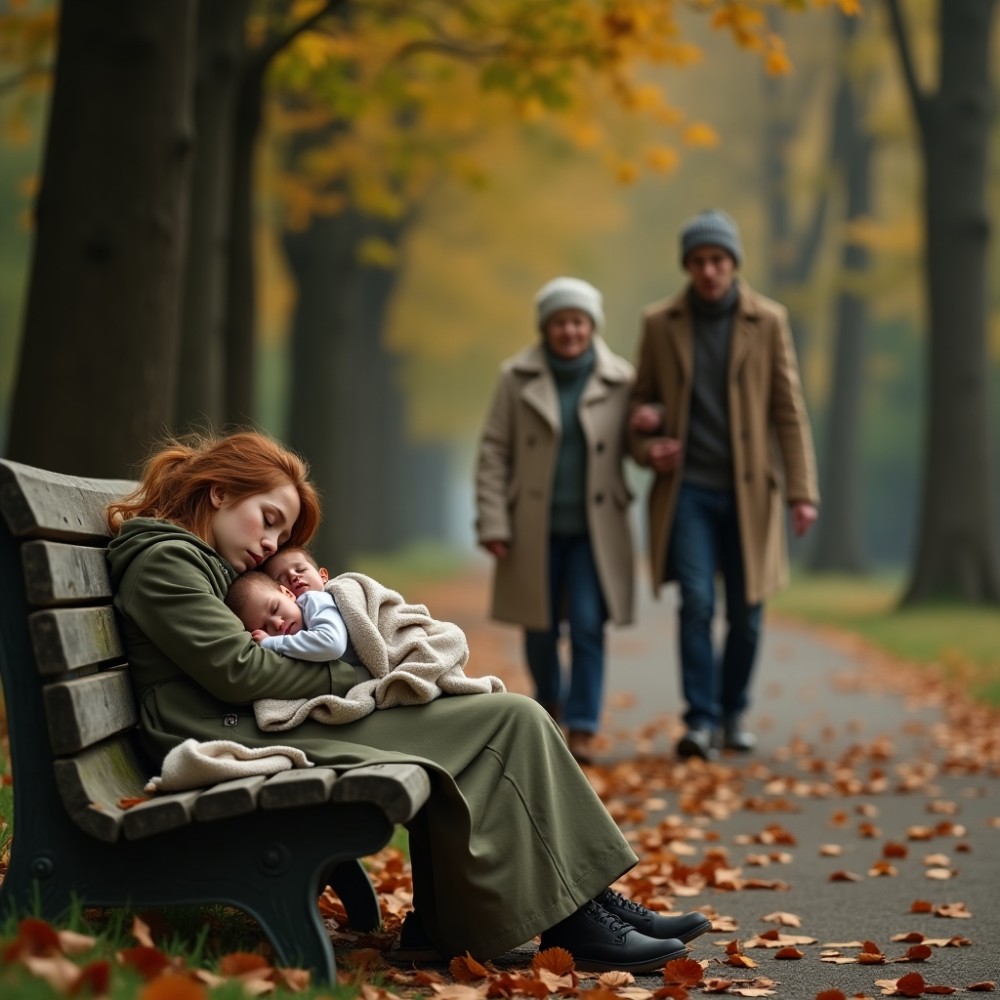 Péter reflexszerűen odanézett. Először csak egy hajzuhatagot látott, rendezetlen, vörösbarna tincsek takarták az alvó nő arcát. A padon két kis test kuporgott mellette: gyerekek. Nem mozdultak. Kicsik voltak, talán félévesek, a takaróik kopottak, a nő kabátja vékony.
